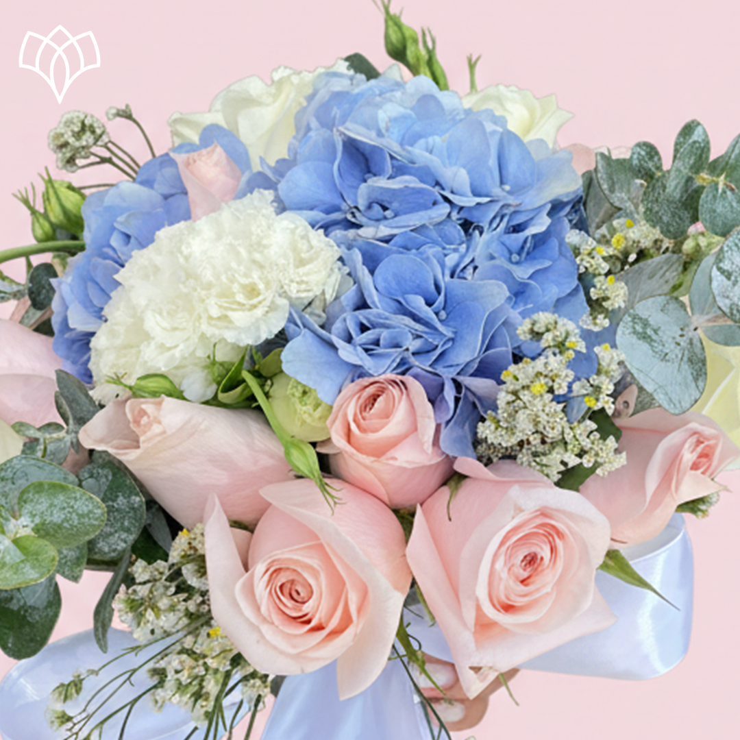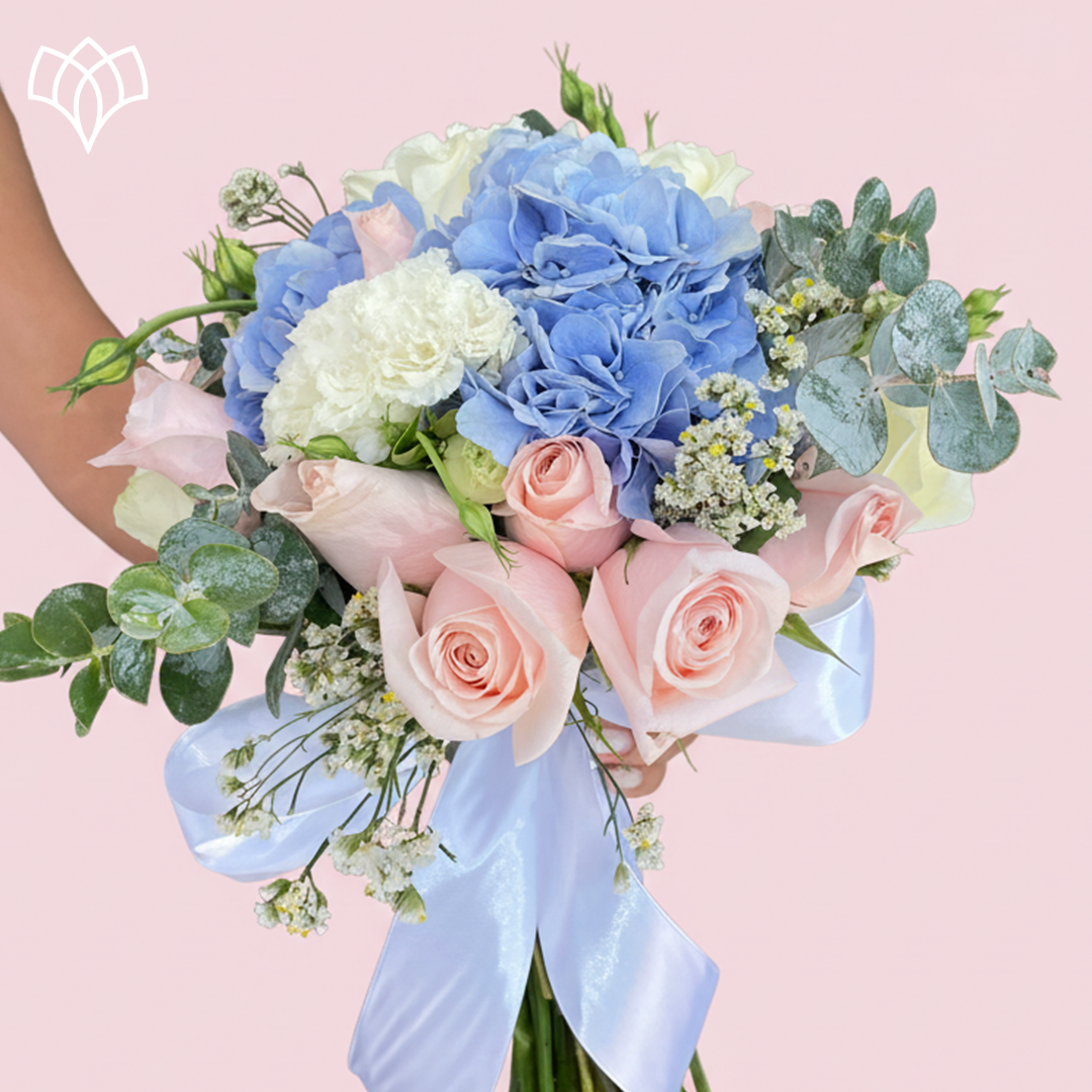 Un ramo romántico y vibrante que fusiona la suavidad de las Rosas rosa pastel con la elegancia de la Hortensia azul celeste. Complementado con Eucalipto, Lisianthus y detalles de flor de relleno, su paleta de ensueño y lazo de satén blanco lo hacen ideal para una boda llena de color y ternura.
