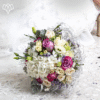 El ramo ‘Brittany’ es una fusión encantadora de romanticismo clásico y diseño moderno. Este bouquet destaca por su corazón de Hortensia blanca cremosa, que le da un volumen suntuoso, y una mezcla de Rosas en tonalidades que van desde el marfil hasta el fucsia intenso y el malva, inyectando un contraste vibrante y apasionado. La composición se enriquece con el verde aterciopelado de las hojas de Dusty Miller y pequeños acentos morados de Limonium o flor de relleno similar, creando profundidad y textura.