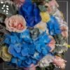 Ramo de novia con hortensias en tonos azules, lisianthus blancos, rosas en tono blanco, rosa claro y follajes, en forma de cascada.