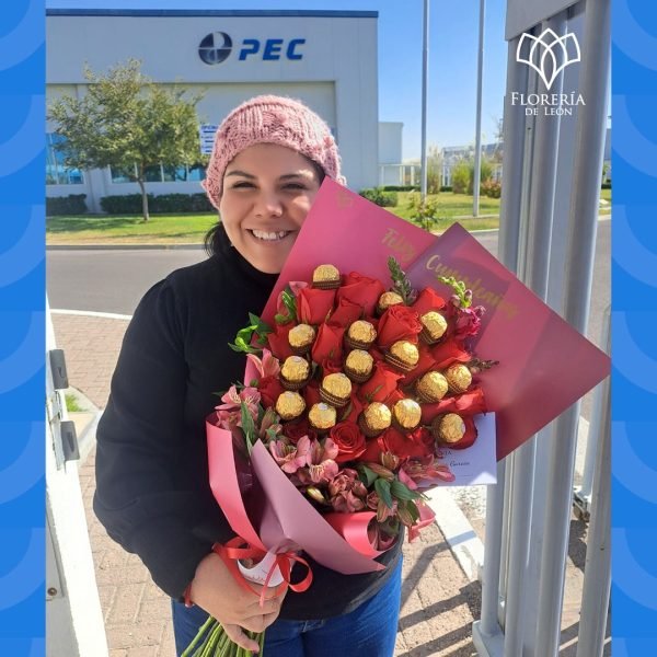 24 rosas coronadas con chocolates Ferrero Rocher. Visto desde el ángulo de la sensualidad. Como si se tratase de un ramo afrodisiaco. En Amanda encontrarás el ramo de rosas rojas más deliciosas del mundo. En el arreglo se intercala las rosas a diferentes niveles, aportando volumen. Apropiado para eventos de etiqueta, celebrar aniversarios, generar conmoción en graduaciones y provocar lágrimas en cumpleaños.