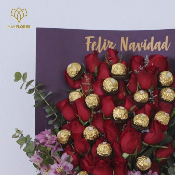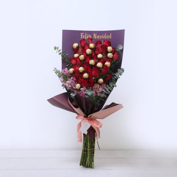 Ramo de 24 rosas, chocolates Ferrero, follajes y papel finos.