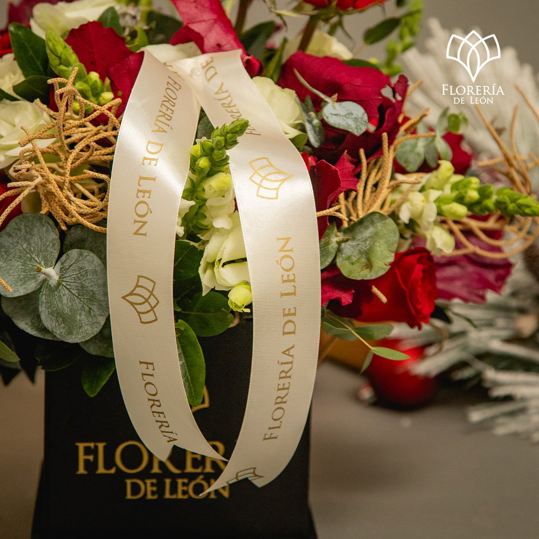 Elaborada en una caja rígida negra con el logo de Florería de León, la Caja Belén está decorada con un listón satinado y detalles en tonos dorados y verdes que evocan la magia de la Navidad.