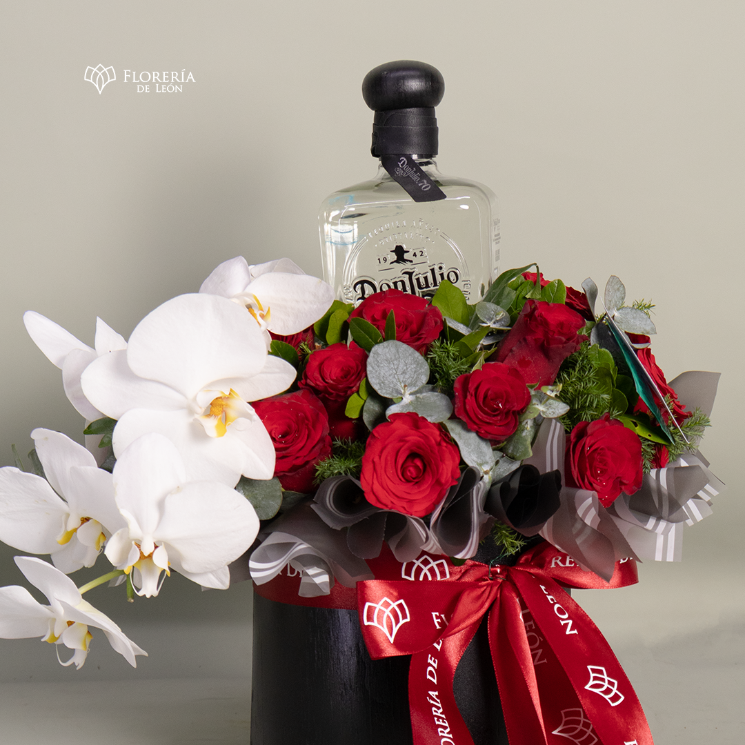 Una combinación magistral que une el prestigio del Tequila Don Julio 70 con la delicadeza de las orquídeas blancas y la pasión de las rosas rojas. Presentado en una elegante caja negra artesanal, este diseño es la elección definitiva para quienes buscan un regalo imponente, equilibrado y lleno de lujo.