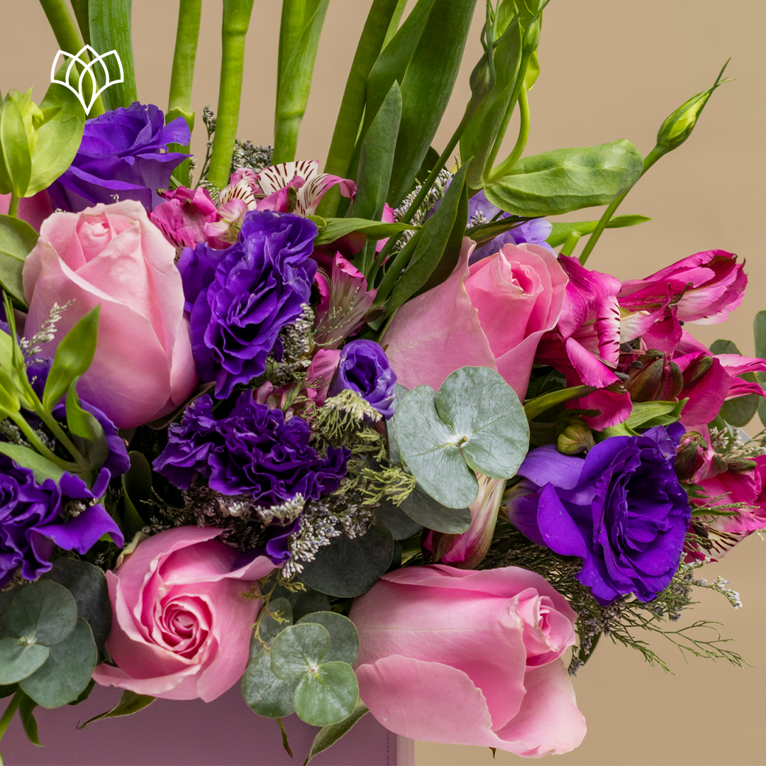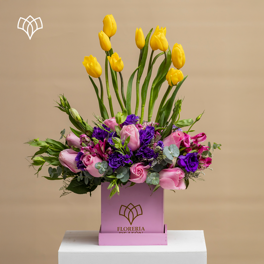Caja en tono rosa claro con 10 tulipanes, 6 rosas, lisianthus tono rosado con blanco y follaje llamado caspia.