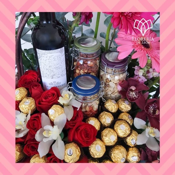 Hazte presente en los momentos más memorables con nuestra canasta: arreglo con rosas, chocolates ferrero rocher, orquídeas en dos tonos, gerberas, follaje fino y para culminar un exquisito vino tinto.