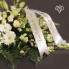 Cojín fúnebre con rosas, gerberas y lilis blancas, además de follajes finos.