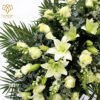 La Corona Celestial es una ofrenda floral de gran presencia y elegancia, ideal para expresar condolencias y acompañar en momentos de duelo. Elaborada con rosas blancas, lilis, flores polares y follajes tropicales, su diseño circular transmite armonía, respeto y paz.