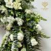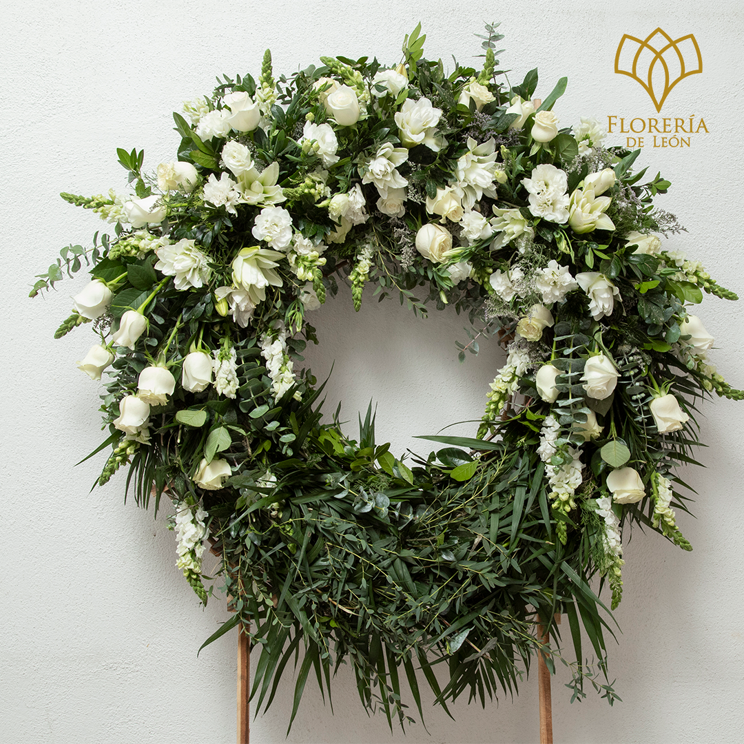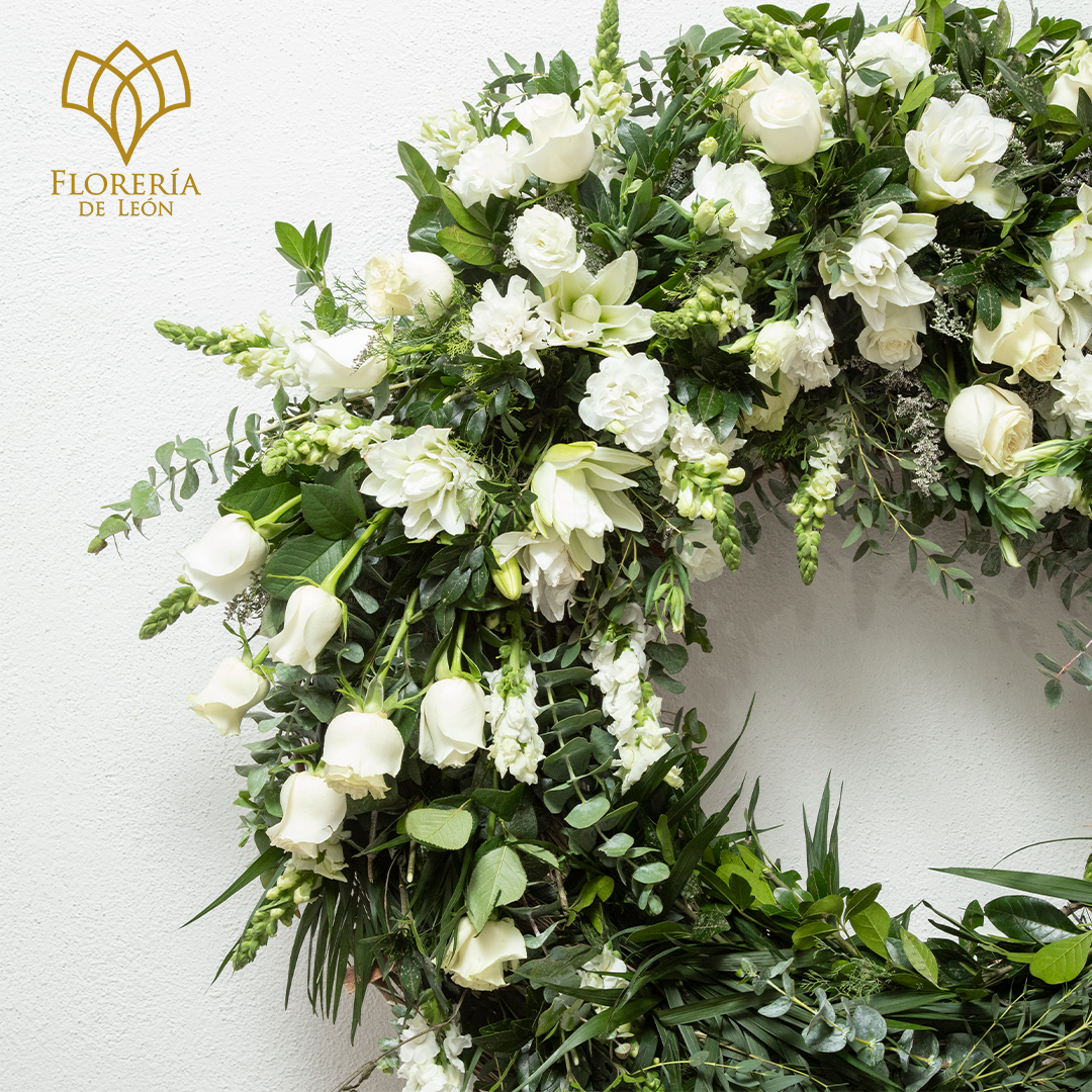 Expresa tus condolencias y rinde un homenaje sereno con nuestra Corona Herradura llena de elegancia inigualable. Este arreglo floral está cuidadosamente elaborado con una combinación armoniosa de rosas blancas, perrito blanco, dólar y astromelia blanca, simbolizando pureza, paz y recuerdos eternos.