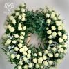 Este elegante arreglo combina la pureza de las rosas blancas con follajes verdes y detalles cuidadosamente seleccionados, simbolizando respeto y tranquilidad. Diseñado para expresar tus condolencias y honrar la memoria de un ser querido, es un gesto sincero que transmite consuelo en los momentos más difíciles.