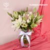 Elegante florero con 24 rosas blancas y follaje fino con base de cerámica geométrica.