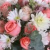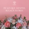 Bonito florero con rosas en tonos pastel y follajes finos.