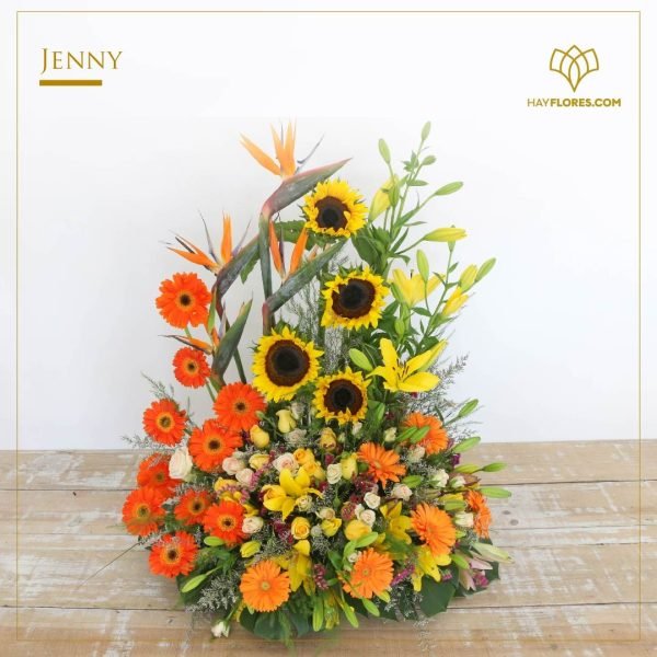 Una explosión de color y alegría que ilumina cualquier espacio. La canasta Jenny combina girasoles, gerberas y Ave del paraíso que transmiten energía, optimismo y cariño. Es el detalle perfecto para celebrar momentos especiales o sorprender con un gesto lleno de vida y emoción.