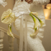 El ramo ‘Fátima’ es la máxima expresión de sofisticación y exclusividad. Compuesto enteramente por majestuosas Orquídeas Phalaenopsis blancas, esta composición abandona el diseño tradicional por un estilo de cascada o presentation bouquet moderno. Las orquídeas, símbolo de belleza, amor y fuerza, se presentan de forma etérea y aérea, casi flotando, gracias a una estructura que realza su forma natural. Los centros amarillos de la flor añaden un toque cálido y sutil. Este diseño minimalista pero de alto impacto es ideal para la novia que busca una pieza central de lujo contemporáneo, que se integre perfectamente con un vestido de corte moderno o de alta costura, y que garantice una declaración de estilo inolvidable.