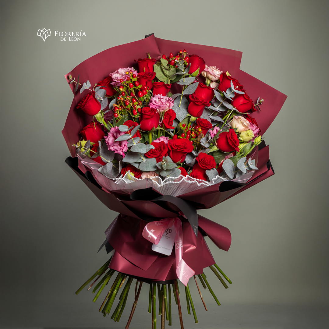 Dale un toque de distinción a cualquier ocasión con el Ramo Fabiola. Su diseño destaca por el volumen de sus rosas rojas y la textura única que aportan las bayas decorativas y el follaje fino. Una presentación artística y moderna que garantiza una sorpresa inolvidable con un acabado de alta gama.