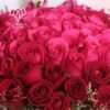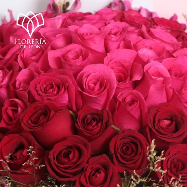 Basado en la expresión de la diversión, el ramo francés con 100 rosas rojas busca una composición casi perfecta, al formar un medio circulo con base de lirios y naturaleza para complementar. Envuelto en un arreglo con tonos fucsia en combinación de las flores. Apropiado para eventos de etiqueta, celebrar aniversarios, generar conmoción en graduaciones y provocar lágrimas en cumpleaños.