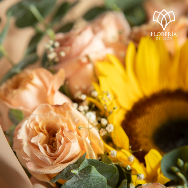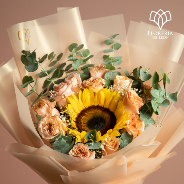 Ya tenemos nueva presentación de nuestro favorito Ramo Girasol Orbitado. Elegante atado de rosas shimmer, girasol, toques de gipsofilia, dolar y bonito papel importado.