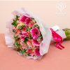 Ramo de 50 rosas rosas atado con follajes y papeles finos.