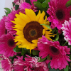 Ramo en forma de bouquet con 12 gerberas en tono fucsia y un girasol en medio.