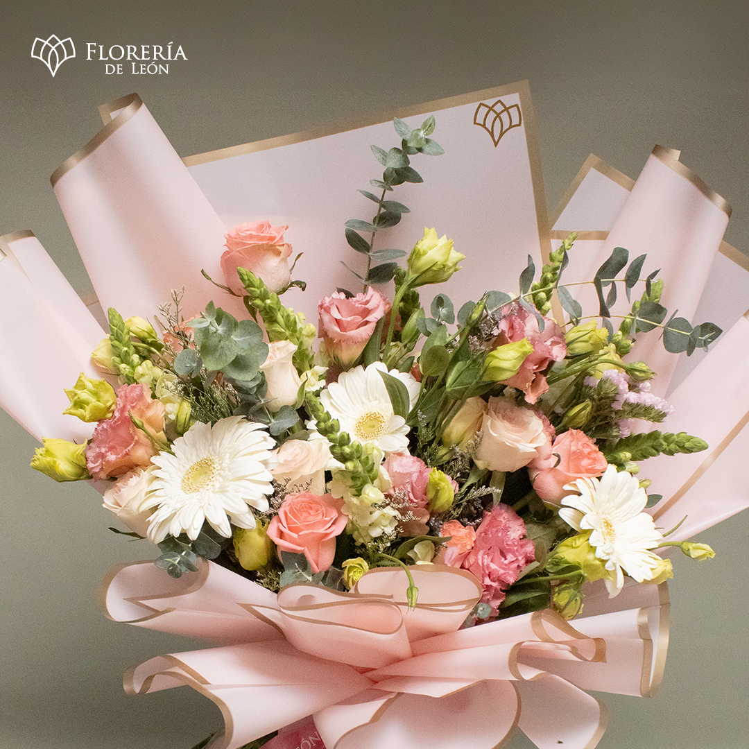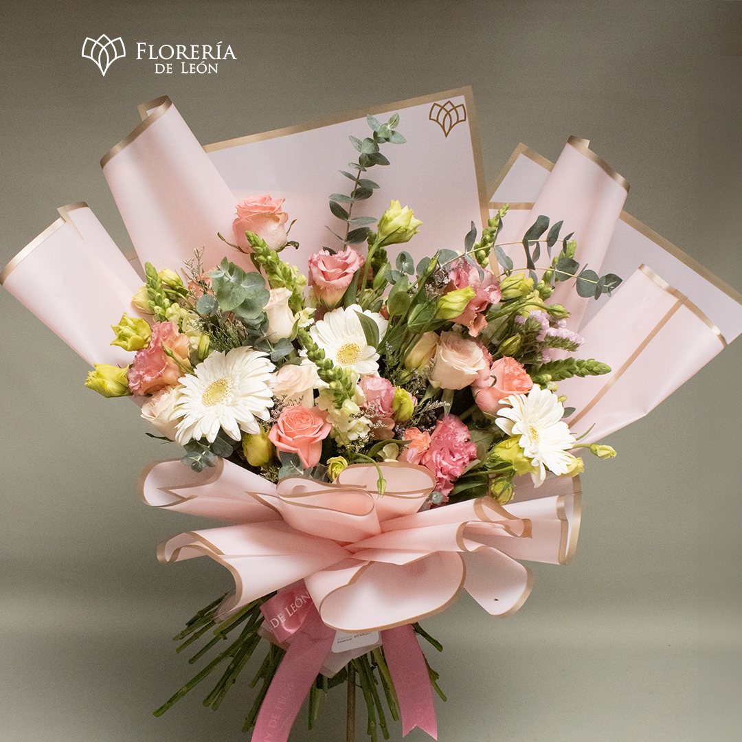 Descubre la delicadeza hecha flores. El Ramo Perla combina la pureza de las gerberas blancas con la suavidad de las rosas y lisianthus en tonos pastel. Envuelto en un sofisticado papel coreano rosa con bordes dorados, este diseño es la elección ideal para expresar ternura, celebrar un aniversario joven o sorprender con un detalle lleno de luz.