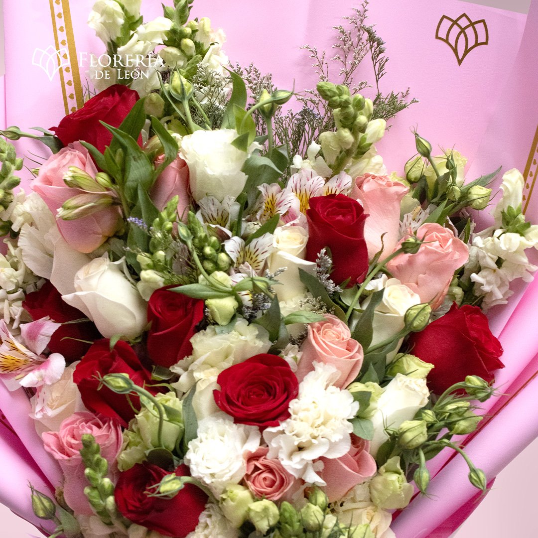 El adorable ramo de rosas blancas y lisianthus, es una muestra de la delicadeza que se puede alcanzar con nuestros detalle. Además, incluye follajes finos y papeles importados. Envíos en León, Guanajuato y Celaya. Servicio a domicilio. Regalo para el día de las madres, aniversarios, cumpleaños, ceremonias, graduaciones, celebraciones, bautizos, bodas. Incluye frase prediseñada o personalizada.