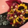 Ramo de rosas y girasoles perfectamente decorado con una caja de 16 chocolates de Ferrero Rocher que se incorporan al ramo. un gran detalle para celebrar un cumpleaños o simplemente para endulzar el día.