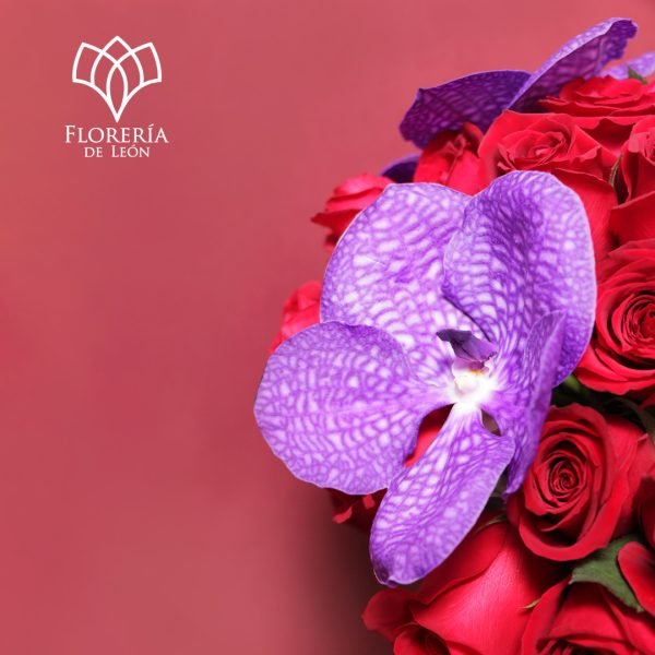 Elegante arreglo de 24 rosas rojas con 2 orquídeas.